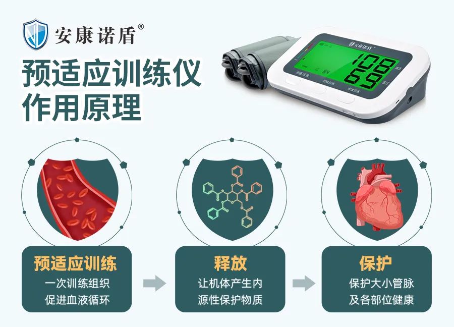 而安康諾盾缺血預適應訓練儀可通過經常對人體進行反復的、短暫的、無創傷、無危害的缺血預適應訓練,激發人體免疫系統的應急機制,從而達到預防心腦血管等疾病的發生。